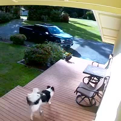 A man walks out of a front door and sits in a chair on a porch with a cup of coffee. He spills the coffee on himself, screams, and quickly takes his shorts off. Security Camera Footage.