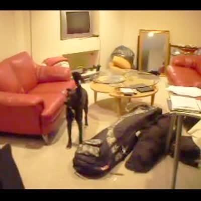 Collie dog chases light from laser pointer that's been attached to his collar. Dog runs in circles on kitchen floor. Shaky camera.