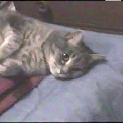 Cat laying on bed. Dog comes up and cat falls off bed. Camera cuts. short clip