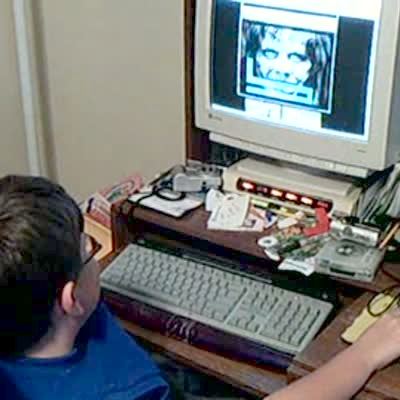 Young boy plays on the computer & gets scared when a screaming zombie face pops up. He jumps up & yells, runs around the house. Practical joke. E-mail prank.