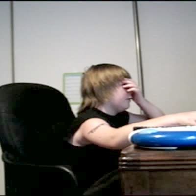 Teen boy gets scared by a screaming face on the computer. He falls backwards out of his chair. Practical joke.