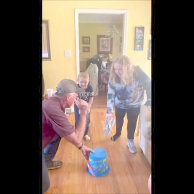 A man and a woman do the computer-mouse-in-the-house prank on a man and he climbs up on a stool and lifts the bucket and walks out of the room and comes back and laughs in the kitchen.