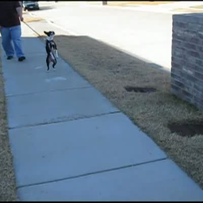 Boston Terrier is walking down the street on leash with man behind him, dog stands on hind legs & walks like a human, whines while walking.