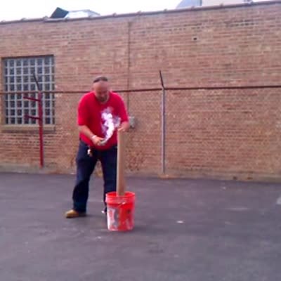 On a concrete parking lot, a man lights the fuse of a mortar firework, where the mortar tube is buried in a bucket filled with dirt. The short fuse immediately burns down and the mortar launches, kicking the bucket into the air and spreading dirt and sand around. The mortar explodes in the air quickly.