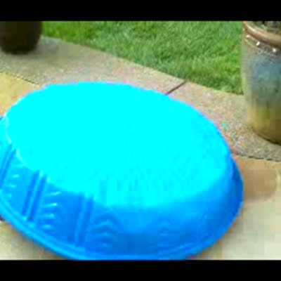 "Plastic Pool Puppy" A yellow lab puppy dog jumps around in a plastic kiddie pool and chews on a plastic water bottle on a concrete porch. He flips the pool over and walks around underneath the pool into the grassy yard. He gets out from underneath the pool. Action in first 35 seconds. Cute.