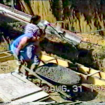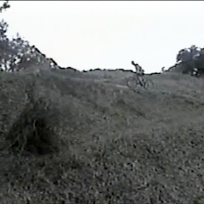 A man flips over the front of his bike while trying to ride on a narrow concrete slab in the woods.