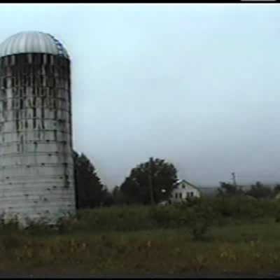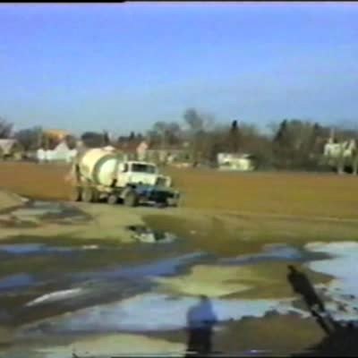 A man puts a small tarp across a driveway before a truck dumps a pile of mulch onto it, but the pile of mulch is much larger than the tarp. Security footage.
