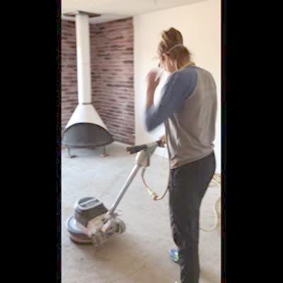 A woman uses a concrete sander on the garage floor and the machine spins out of control and she loses her grip.