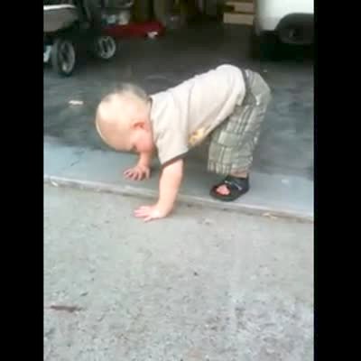 A baby boy walks to mom and is extra careful to climb over a one inch lip of concrete in their garage.