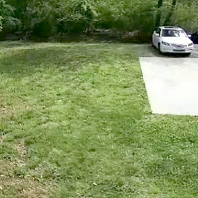 A man runs out of a garage and falls on his face in a driveway. Security footage.