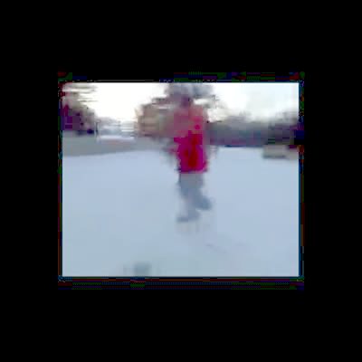 Two twin boys ice skate and fall over a concrete wall in the snow.