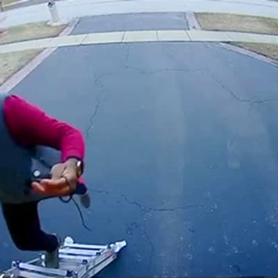 A man works on a ladder against a house, then he falls off of it and does a backwards tumble when he lands on the driveway. Security footage.