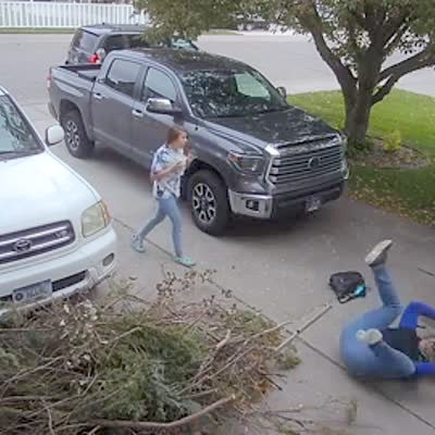 A woman carries a box into a garage and wipes out onto the concrete. Security footage.