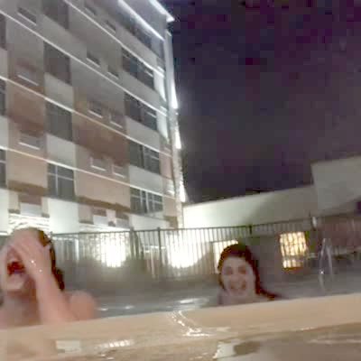 A teen girl slips and falls as she runs on wet concrete and she lands in a pool at night.