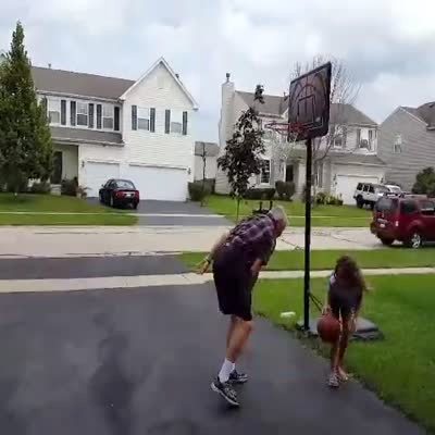 A senior man and a young girl play basketball together in a driveway. At :39, the grandpa throws the ball and falls back hard onto the concrete. The woman behind the camera screams and runs up to him.