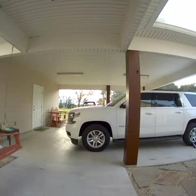 A young girl attempts to ride a skateboard in a carport as she wobbles and falls into a parked SUV, then runs off and slips and falls again on the concrete. Security footage.