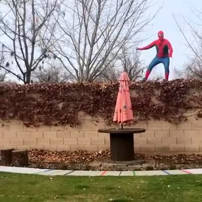 A man dressed in a Spider-Man costume walks along the top of a concrete wall. He jumps onto a table, and falls down in a yard while adults and kids laugh.