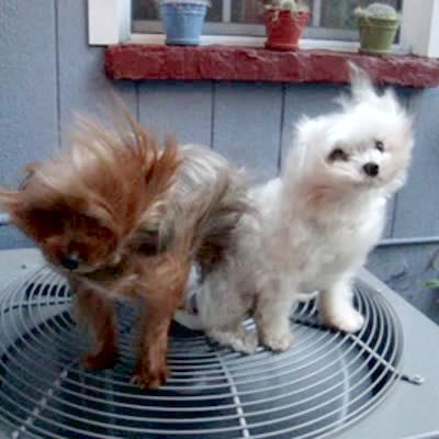 A polish chicken bird stands on an air conditioner fan. His feathers blow upward like a bird version of Marilyn Monroe