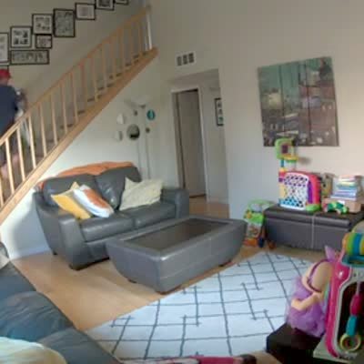 A man knocks several picture frames off a wall as he walks upstairs with a portable air conditioner.