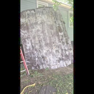 A man drops a piece of roofing off a roof. It falls to the ground and knocks an air conditioner into the house