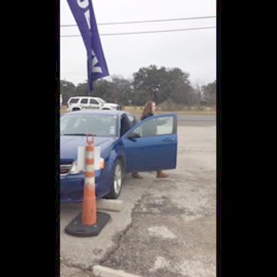 A young boy says "who's scared of the camel now?", then the car window rolls down and he screams at the camel at a drive thru safari park.