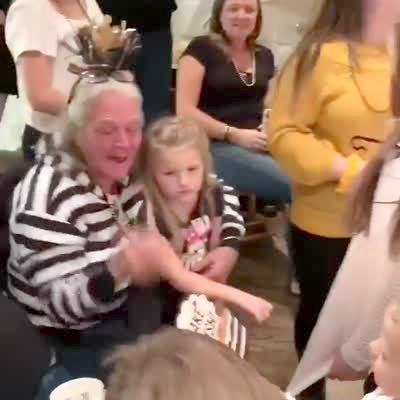 A senior woman sits on a living room couch with her family and wishes for 70 more years and a young girl says "How about 25?"