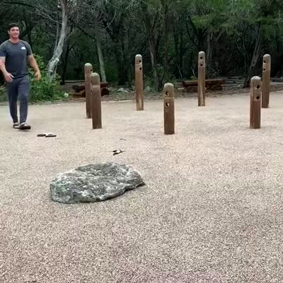 A man runs across wooden poles at a playground park with sandals on then slips and falls on his groin.