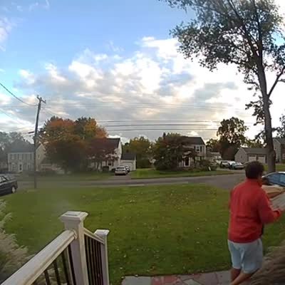 A pizza delivery driver offers to open the front door to a man's house when he accepts multiple pizzas. The man says "no, I got it," then he trips and falls, but he catches the pizza. Security footage.
