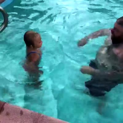 A tot girl in a swimming pool says to her dad "I got it" and tries to swim and sinks. He helps her up and she says "I don't got it."