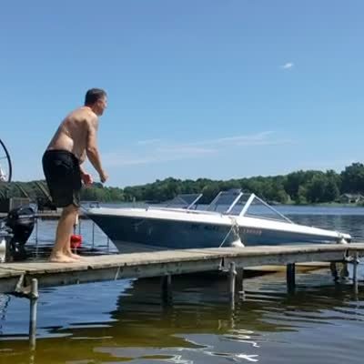 A man jumps off of a dock and falls when he tries to land on a raft.