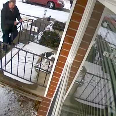 A man walks a Bulldog dog down the front porch but the dog's harness comes off. The man doesn't notice and continues to walk as the dog watches. Security Footage.