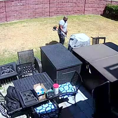 When a backyard awning is blown away by the wind, a man mowing the lawn does not react continues his yardwork. Security footage.