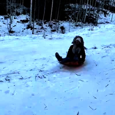 A woman sleds down a snow covered driveway and tumbles out of the sled, does a somersault and lands back into the sled before continuing down the driveway.