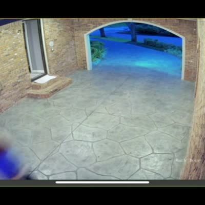 A dog's leash falls off on a front porch as a man continues to drag the leash, unaware. Security footage.