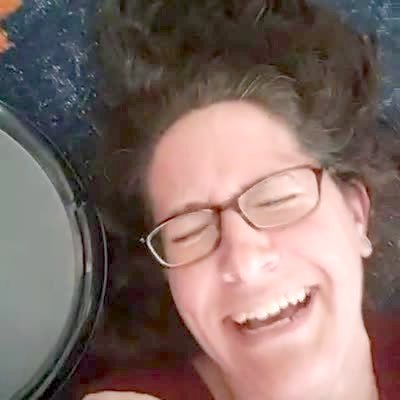 A woman records herself as she lies on the house floor and her Roomba vacuum gets caught on her hair. She laughs then continues the video with her hair stuck in the vacuum.