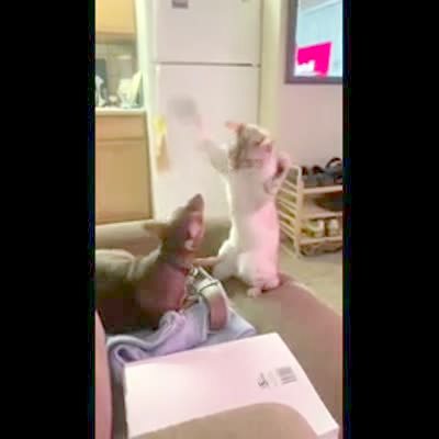A cat smacks a Pinscher dog on the face and then continues smack even harder with both paws.