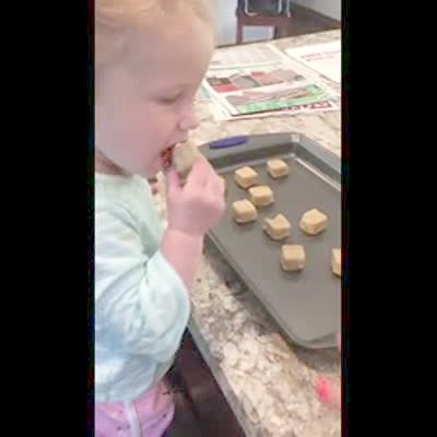 A mother films cookie dough pieces on a baking sheet in the kitchen and says "there's supposed to be twelve," then she turns the camera to show that her baby girl daughter holds a piece of cookie dough and sucks on it.