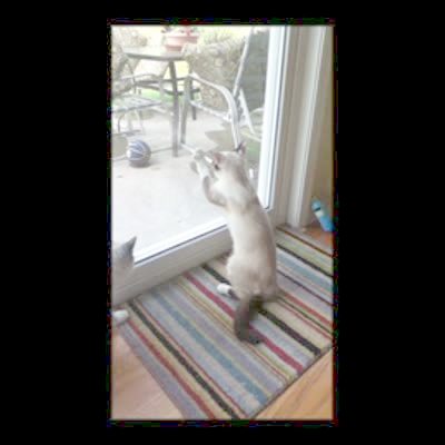 A woman says "head catch," then throws a baseball cap onto a tot boy's head in a backyard and laughs.