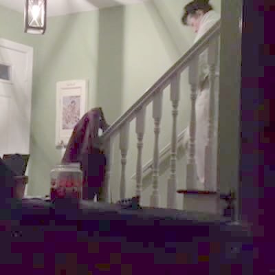 At 1:20, a man stands still in the corner of the living room dressed as Santa, then jumps and scares a woman when he says "Ho ho ho".