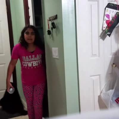 A teen girl hides around the corner and a man walks out of the bathroom and looks down at a dog and she jumps out and says "pow!" and he jumps and shouts "don't do that" and almost falls.