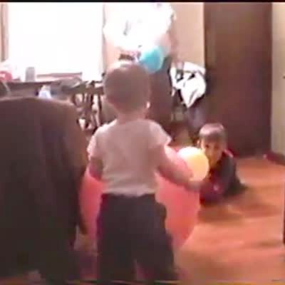 Tot boy plays with big pink ball in dining room, rolls it towards senior man. Grandpa trips over it & falls down, slides into corner. Short tail, no recovery.