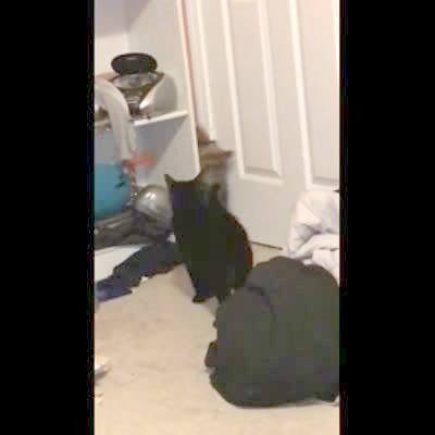 Two women scream in a bedroom when a mouse runs out of a closet after a cat corners it.