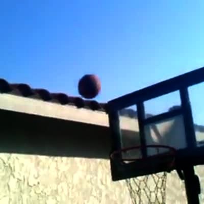 A man shoots a basketball that bounces off the corner of a roof and goes through the hoop.
