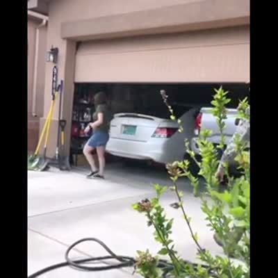 A woman in an army uniform hides around the corner of a house as a woman exits the garage, and then she sneaks up on her and taps her shoulder. It scares the woman at first, but then when she realizes it's her daughter home from duty she gets emotional. military homecoming