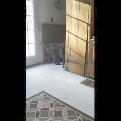 A person records a video from the living room of two dogs whose butts stick into the room around the corner of the hallway while their tails wag together.