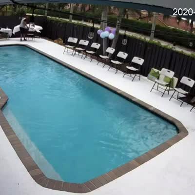 A man carries a table alongside a pool and he missteps over the corner and falls in. Security footage.