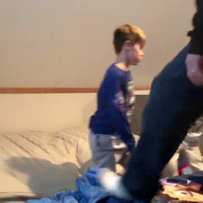 A young boy sits on a corner of an air mattress and a man jumps onto the mattress and the young boy goes flying across the room and we hear a crash.