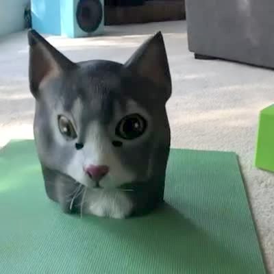 A woman puts a cat mask on a yoga mat to deter her cat from it. Her cat hides in the corner of the living room with its ears down.