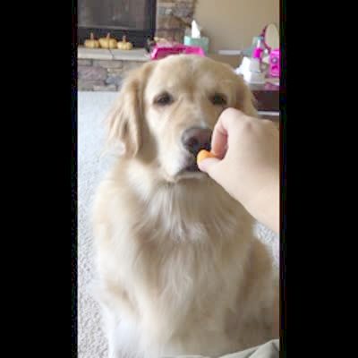 A Golden Retriever dog coughs a cheese puff on to a couch when a man holds another one in front of their face in the living room.