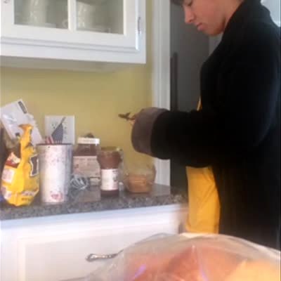 A mom pranks her teen boy son and puts hot sauce in his Nutella spread. He puts it on toast and eats it, then makes a confused face. He coughs and spits up in a kitchen sink and his family laughs hysterically.